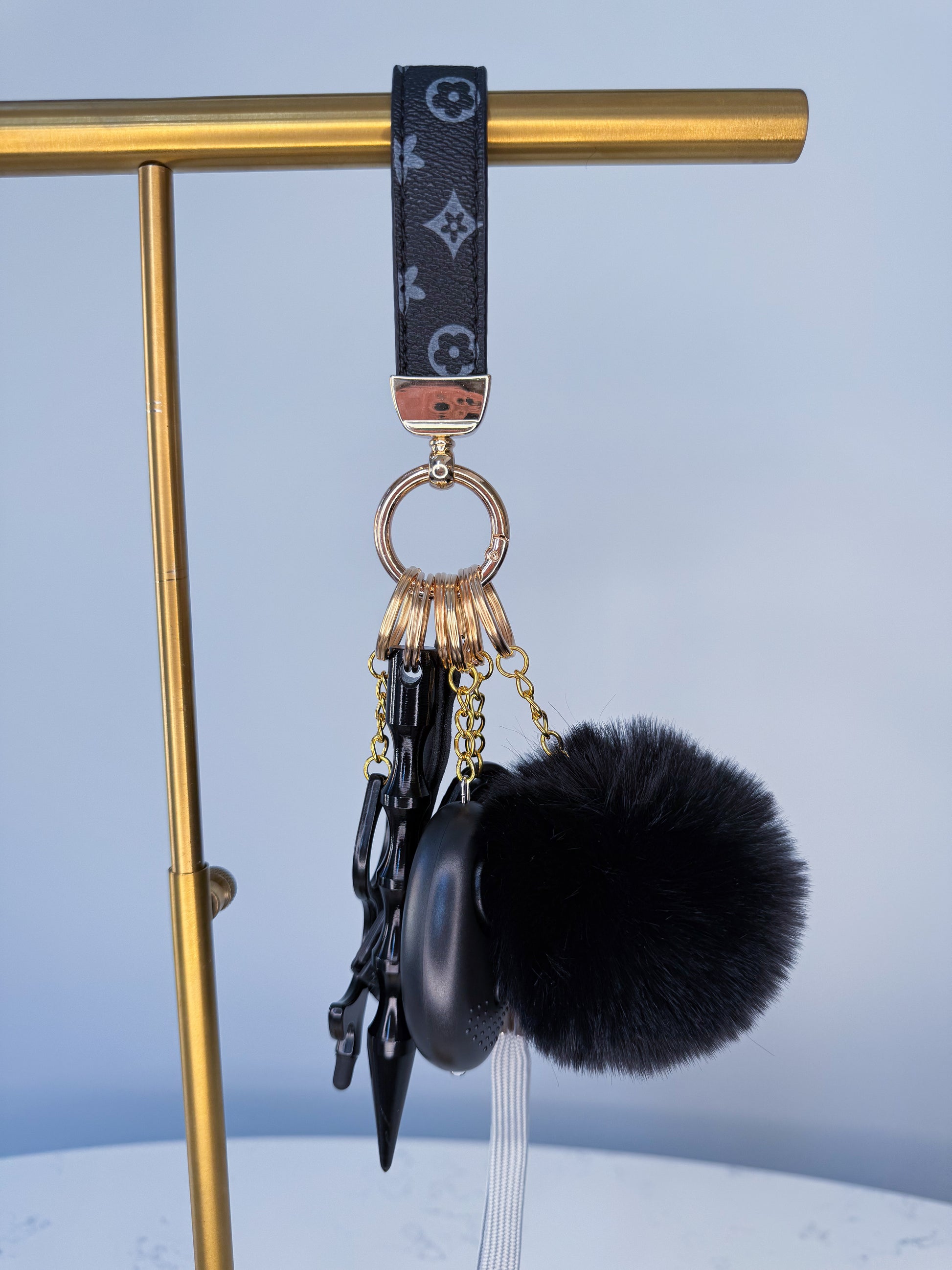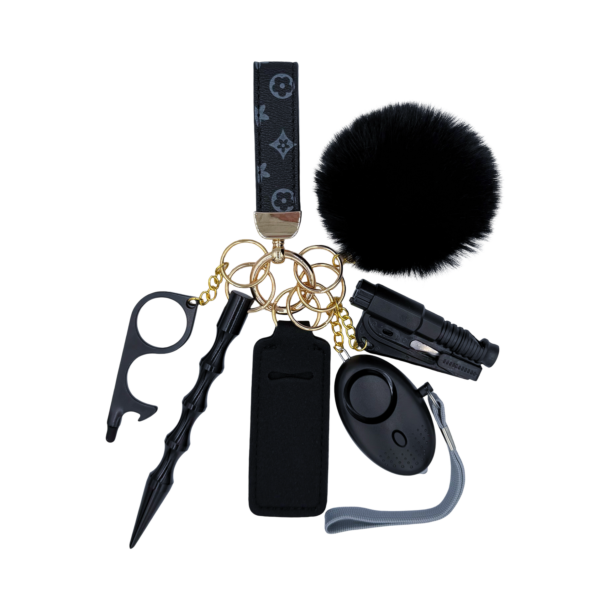 Distinctive and luxurious. The 7 piece Black Monogram Safety Keychain with gold detail, provides all of the essential items to create one perfect keychain. Conveniently swap out or remove any piece depending on how you want your keychain to look. Lightweight and easy to store in your purse, car, or side table.Â