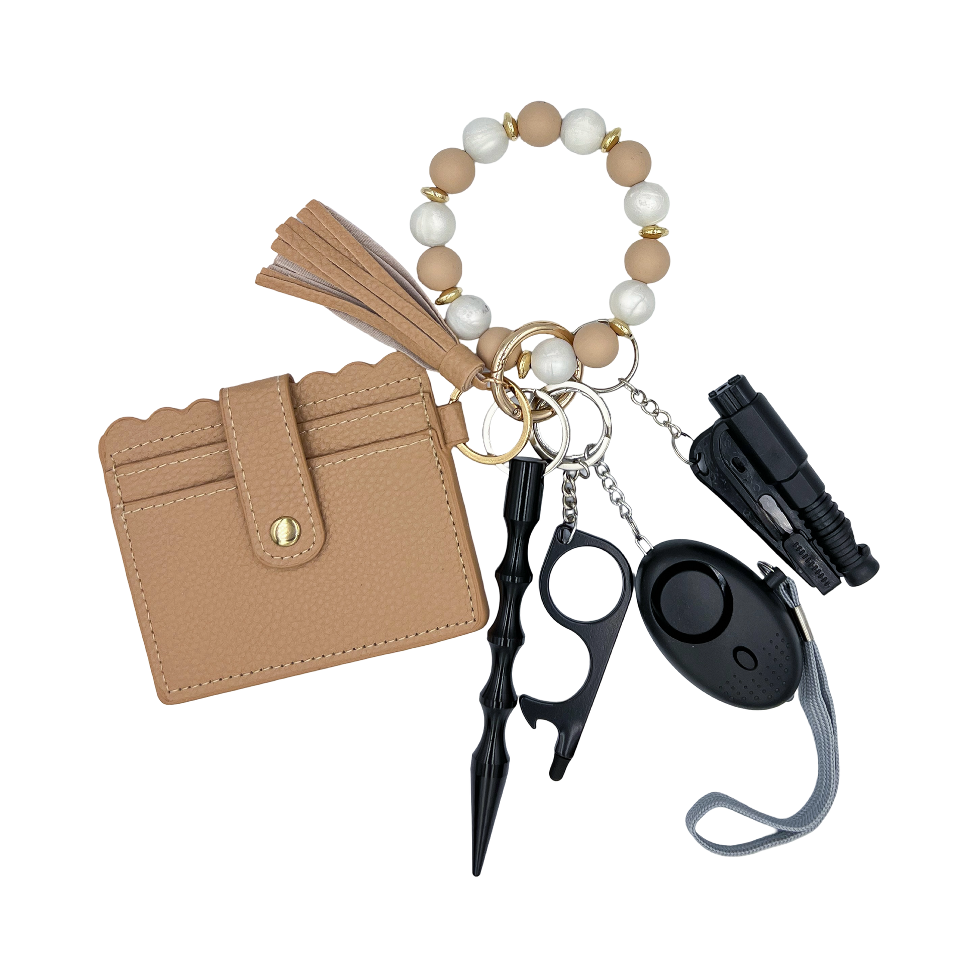 Playful, yet classy. The 6 piece Khaki Beaded Wallet Safety Keychain provides all of the essential items to create one perfect keychain. Conveniently swap out or remove any piece depending on how you want your keychain to look. Lightweight and easy to store in your purse, car, or side table.