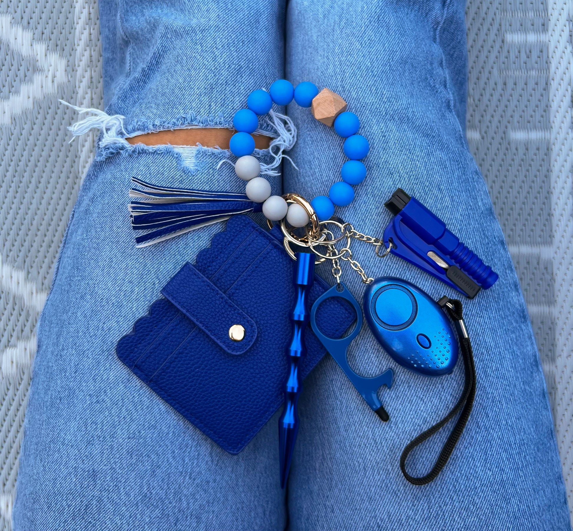 Playful, yet classy. The 6 piece Royal Blue Beaded Wallet Safety Keychain provides all of the essential items to create one perfect keychain. Conveniently swap out or remove any piece depending on how you want your keychain to look. Lightweight and easy to store in your purse, car, or side table.